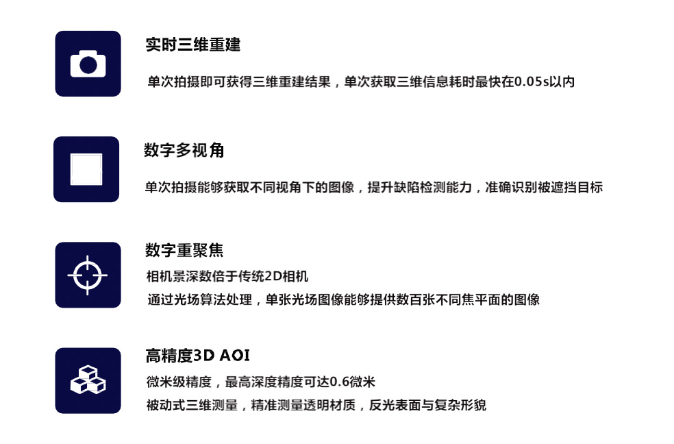 核心产品光场相机通过仿生昆虫复眼结构,结合计算成像技术,可以实现对多维度光线信息的瞬时记录,拥有独特的“单次拍照、多重视角图像同时摄取、三维精准测量”能力,完美的解决了透明、反光、微深孔等产品三维检测的难点。